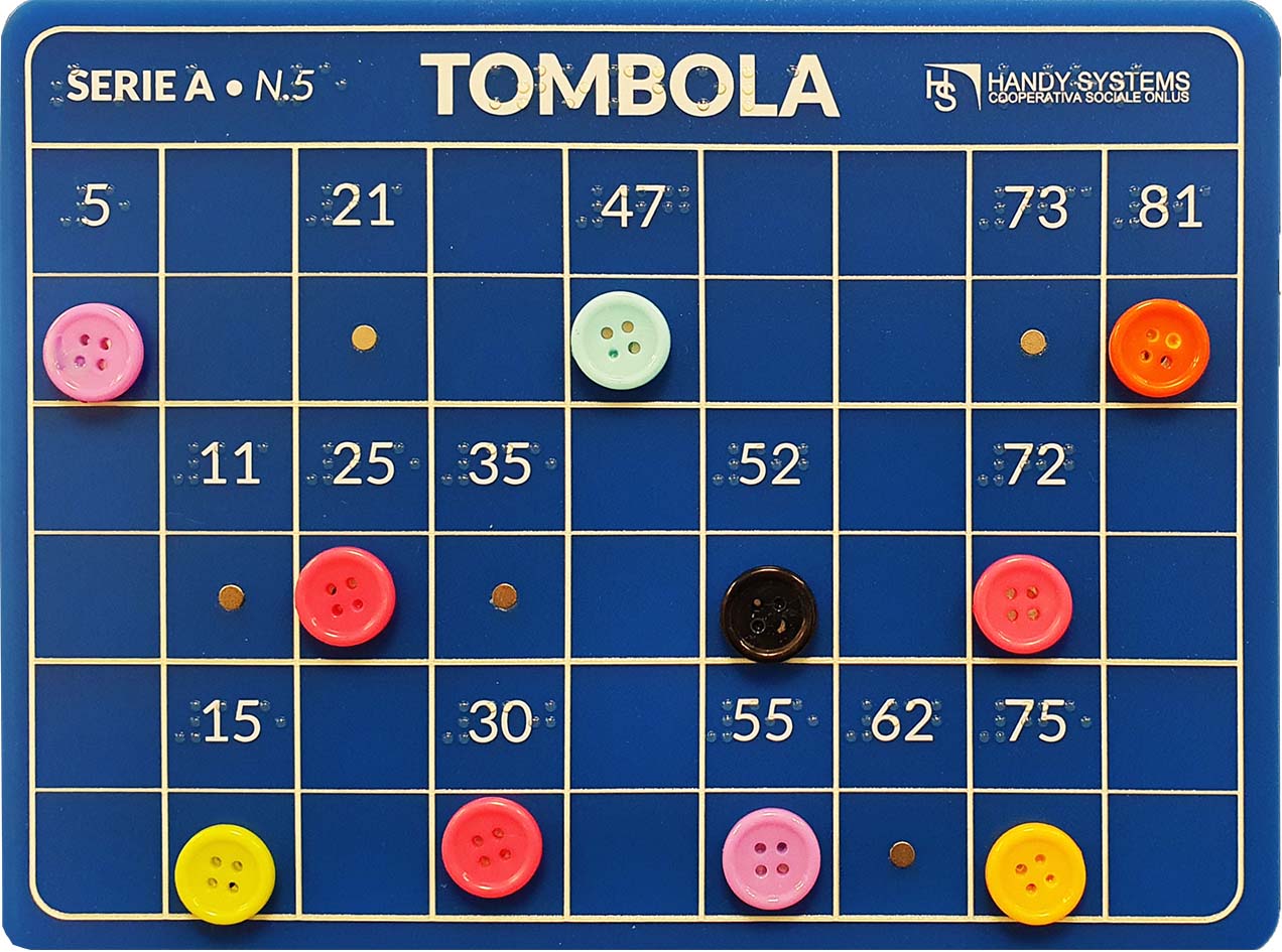 La tombola oltre a essere tattile e con scritte Braille è anche in quadricromia così da poter giocare insieme agli amici vedenti.